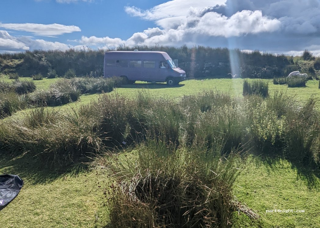 Fairly level layby for 2, road is quite busy up to about 11 and again from about 6. Typical horn blower at 7:30, thought they would wake us up, LOL. Stayed one night to awake with beautiful scenery and sheep asleep next to van. Bit noisy but there are many worse places than this, would stay again if in area. No bins or services.