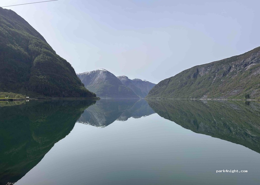 Posto tranquillo nel verde con toilette pubblica pulita e con acqua calda. Non direttamente sulla strada ma un po' più in basso, quindi più silenziosa di altre aree di sosta. Rete cellulare da molto debole a assente. Il fiordo è a pochi passi, ma non c'è vista dal parcheggio.