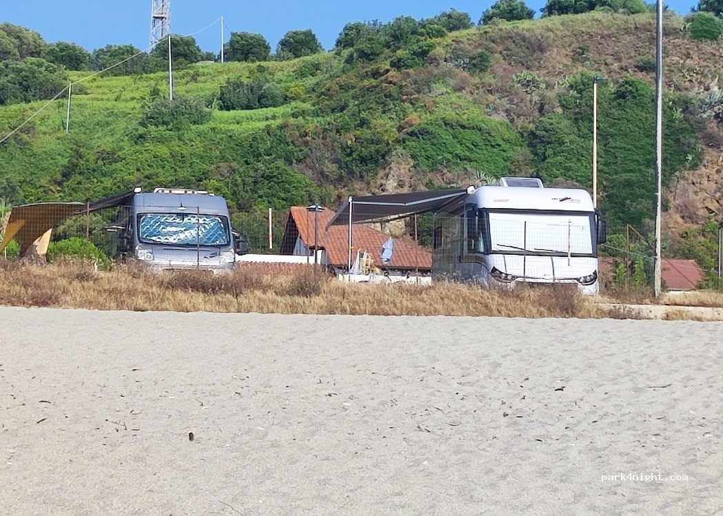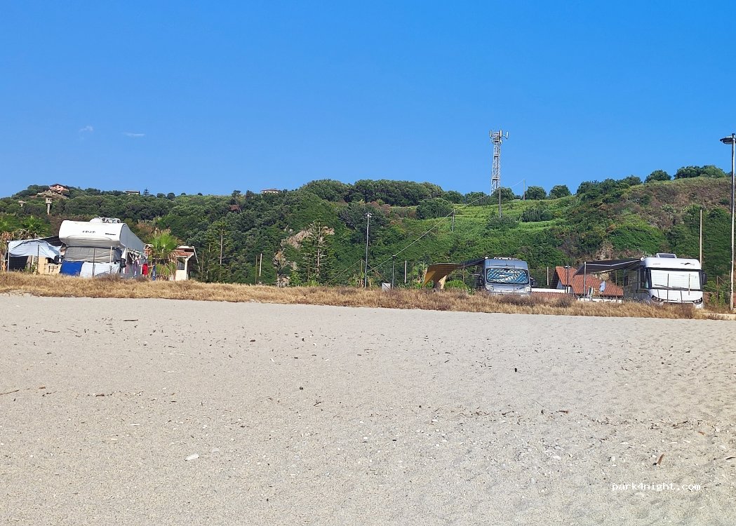Emplacement accolé à la plage de sable et de petits cailloux . Nous avons été très bien accueilli propriétaire sympathique. Service fonctionnel douche froide ou chaude pour 1€ à acheter au bar. 23€ en septembre électricité compris. Arrêt de bus pour Palmi à proximité.