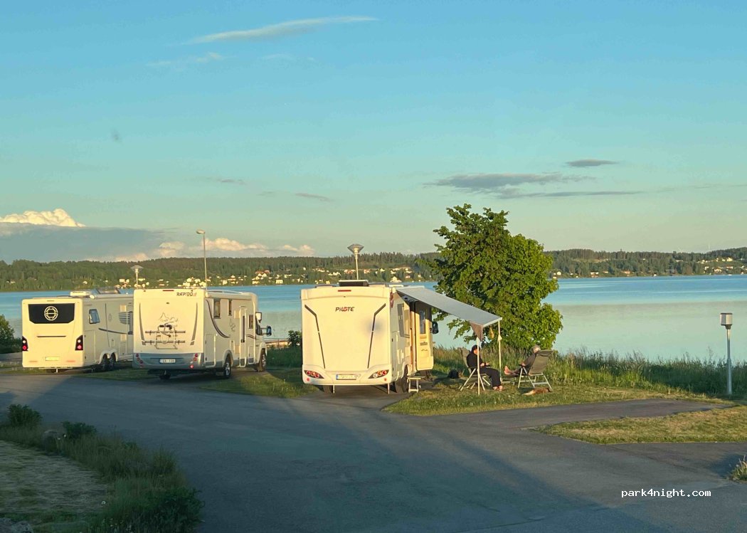 Schöner Stellplatz mit allem was man benötigt (Strom, Ver- und Endsorgung) und einem tollem Blick auf den See. Man steht auf zwei Ebenen. Angel- und Bootssteg vor Ort. Gepflegte Anlage. Ruhige Lage trotz Stadtnähe und die Berufsfeuerwehr ist auf der anderen Straßenseite. Das gibt auch Nachts wenigstens ein gutes Gefühl in Stadtnähe. Das alles gibt es für schlappe 150 Kronen pro Tag maximal 48 h.
