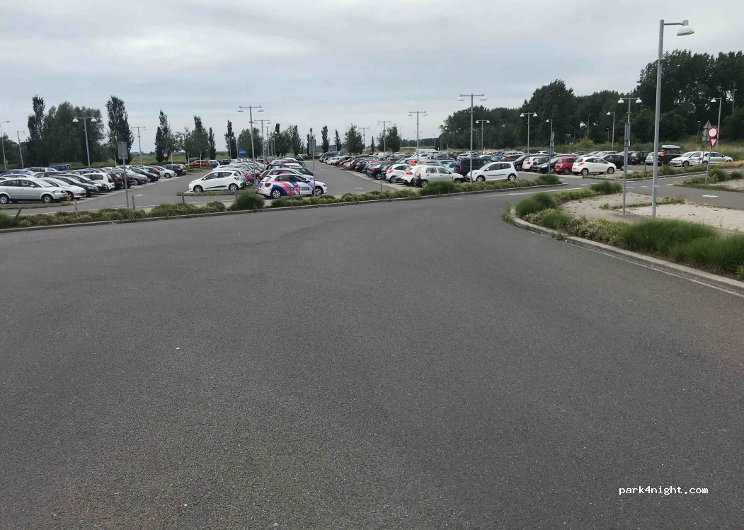 Espace P R pour véhicules courts. Gratuitement. Grand et clair. De là, il y a des bus toutes les 10 minutes vers le centre-ville de Groningen. Une photo montre à quel point les places de stationnement sont longues ou courtes sur la base d'un Ford Transit. Il n'y a pas de panneaux interdisant les nuitées, mais l'endroit n'est ni accueillant ni calme.
