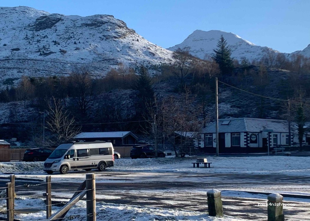 Stayed here and went to the bar and had a pizza at the crianlarich hotel. Also a pint at the rod and reel. Great village to stop at and a bargain at £5 to stay in the car park. Pay the fee and spend in the village to make the van life people welcome. Such lovely folks here.
