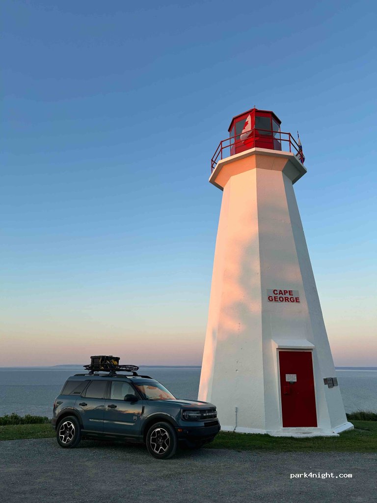 Au phare de Cape George, quelques places de stationnement et accès à des tables de pique-nique. Vue incroyable sur la mer et espace très calme. Avant d'arriver au phare, le parc un peu plus bas comporte des latrines et des sentiers de randonnée.