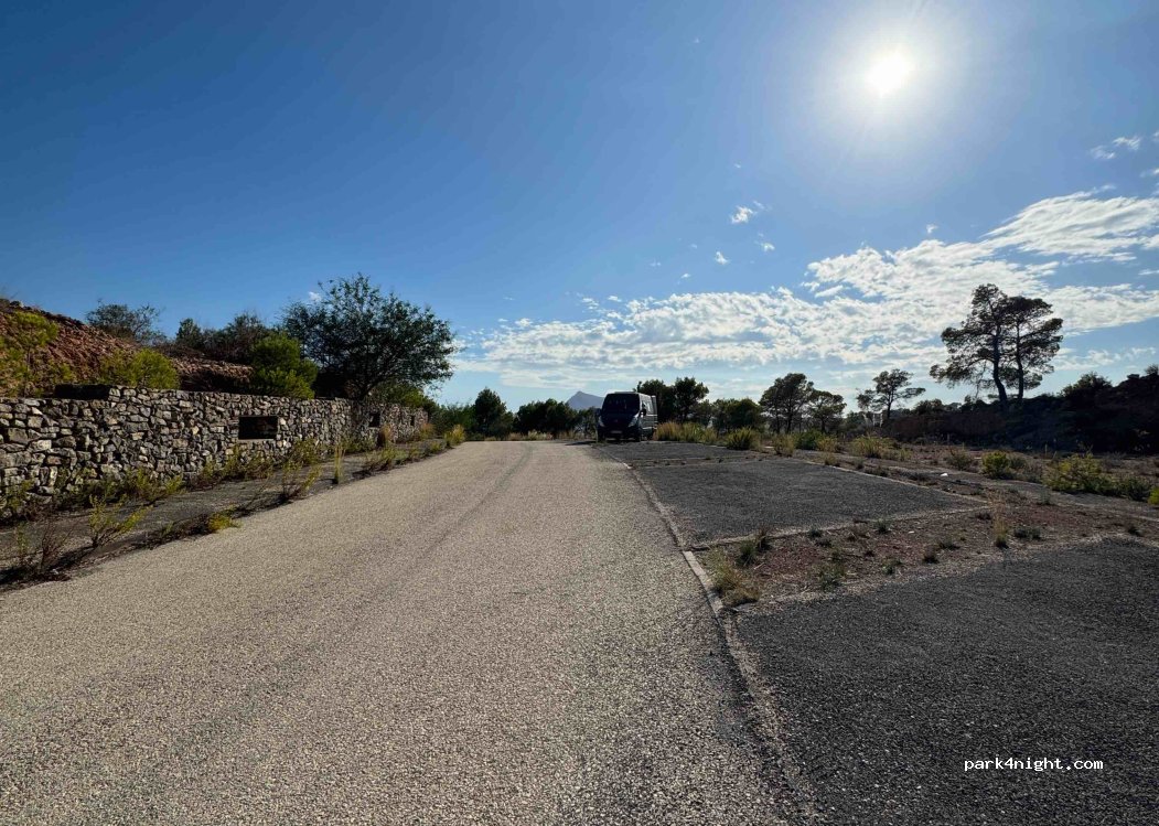 Traumhafter Ort!! Atemberaubender Blick auf die Berge und teilweise Meer. Sackgasse eines ungebauten Wohngebietes (angeblich Start 2025/ Altea Sense). Bis auf Straßenlärm ist nichts weiter zu hören. In der Nacht ruhiger. Über einen Weg und eine Treppe gelangt man hinab zum Kiesstrand und zur Promenade Richtung Altea. Dort gibt es auch Mülltonnen. Anfahrt war etwas abenteuerlich (16% Steigung).
