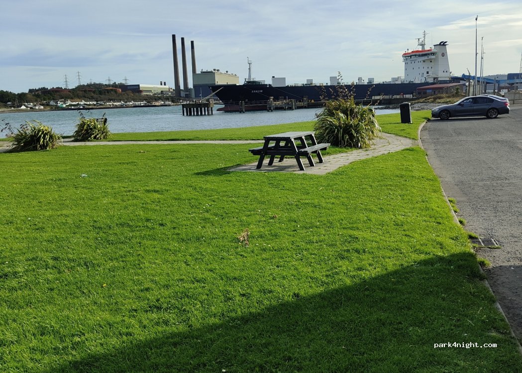 Along a dead end next to the Larne ferry port. No service. Very nice view of the Larne pass and the entrance of the ferries. 5 minutes from the pier.