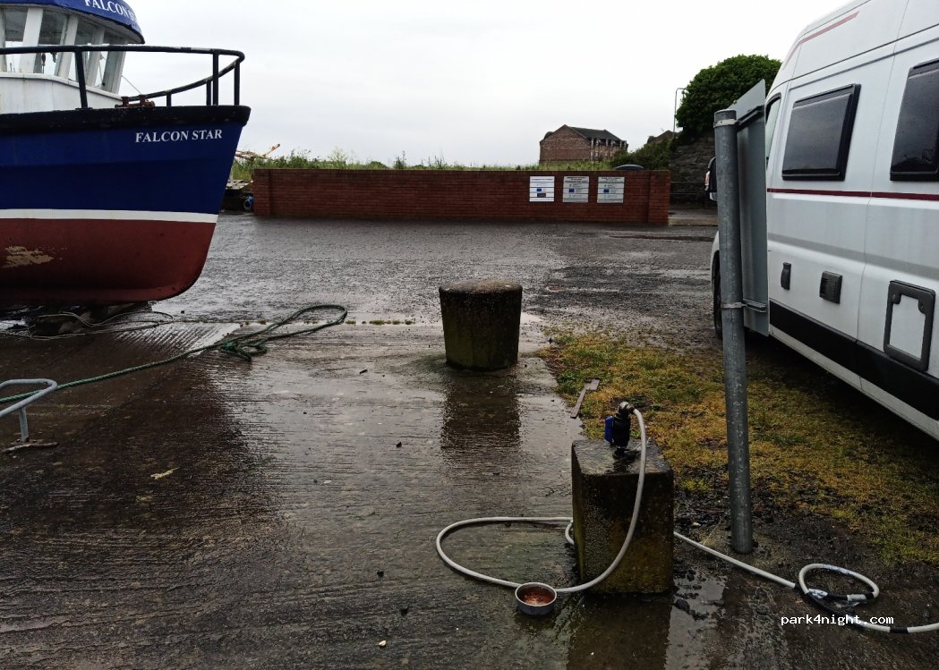 Parking, avec possibilité de prendre de l'eau. Pour l'électricité, il y a 4 prises qui sont dédiés aux marins pêcheurs, peut-être dans la mesure où elle ne sont pas utilisés, nous pouvons nous brancher est ce que cela va durer, autrement, il y a le pub très sympa. Pour dormir, calme nous étions au mois d'avril.
