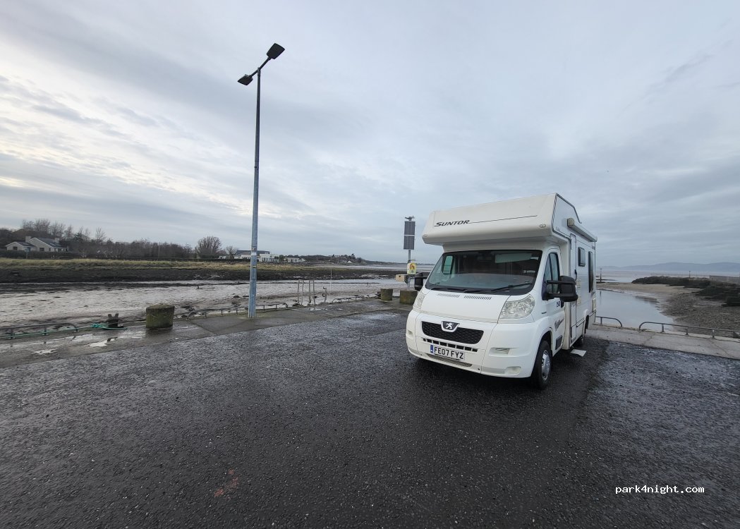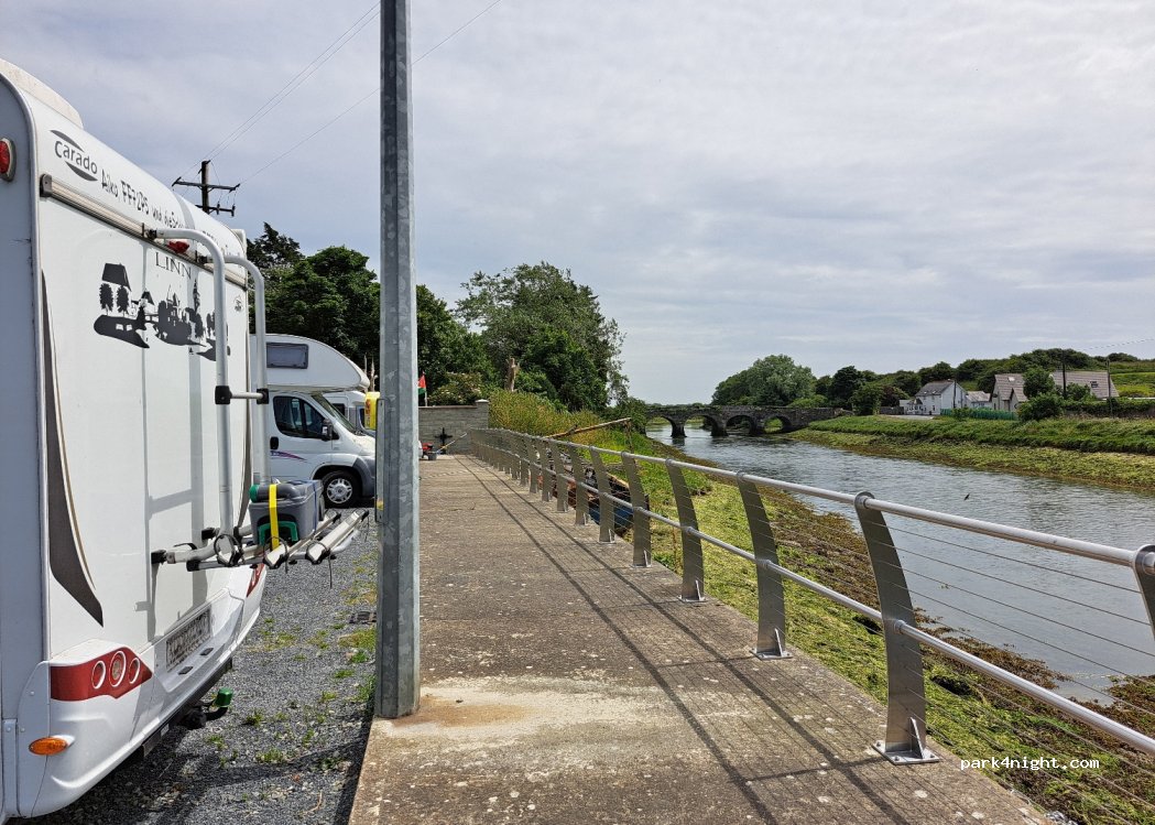 Parking du port. Beaucoup de places le long du quai et 50 mètres avant parking en gravier. Poubelles, eau et vidange eau grise possible. Il y a aussi des prises de courant, un usager du port m'a proposé de me brancher. En demandant, il est possible d'avoir du courant. Superbe vue sur les montagnes derrière la baie de Dundalk.