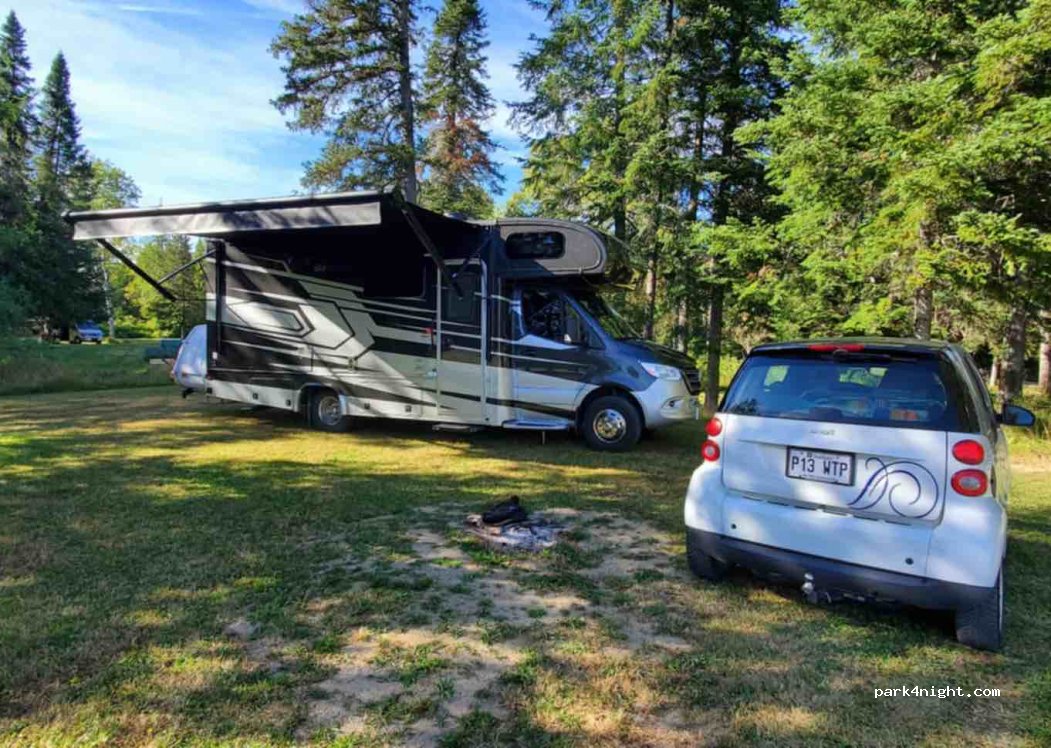 Une halte avec emplacements individuels. Certains ont des tables de pique-nique et des foyers. Peut-être pas assez grand pour les très grandes plates-formes, mais pour les petites/moyennes tailles, c'est parfait. Les salles de bains ont de l'eau courante, je ne sais pas si c'est potable.