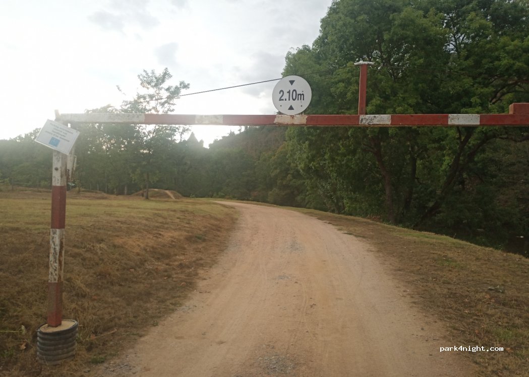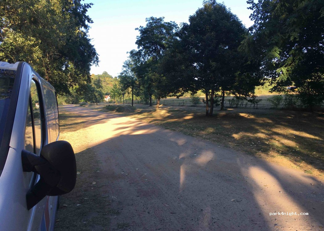 Großer Parkplatz auf Rasen, Zufahrt auf 2,10 m begrenzt, aber als wir ankamen, war die Schranke offen. Der nahe gelegene Fluss ist sehr ruhig. Die kleine Stadt mit Charakter ist nicht sehr weit (1 km). Ein schöner ruhiger Ort auch im August.