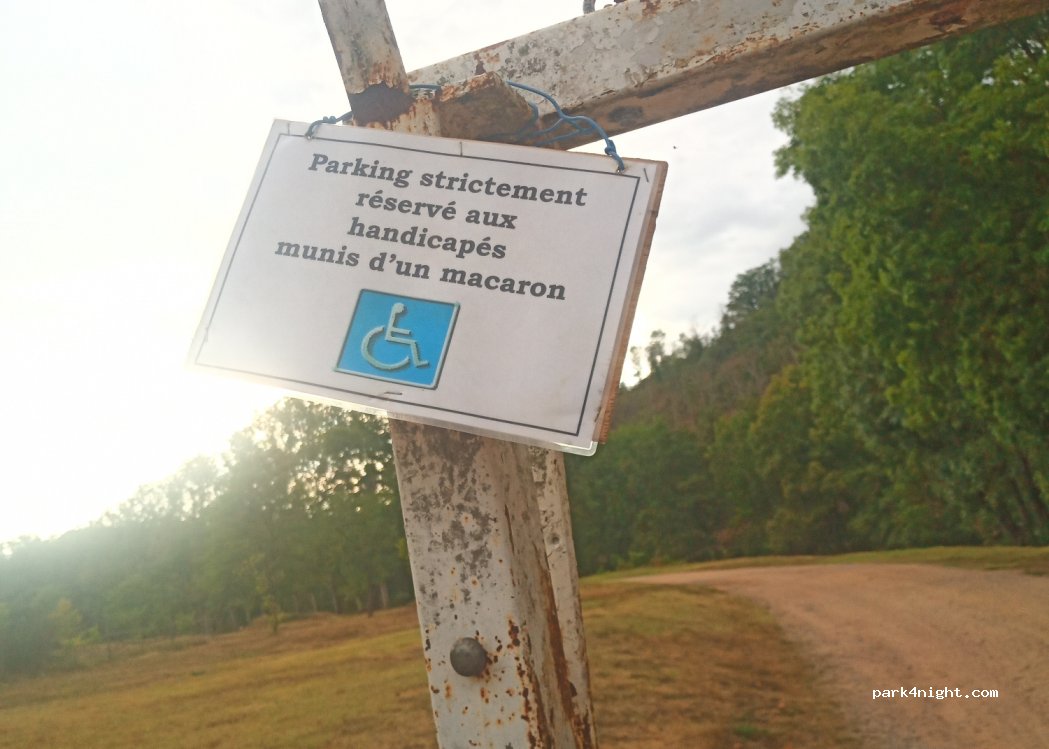 Large car park on lawn, access is limited to 2.10 m, but when we arrived the barrier was open. The nearby river is very calm. The small town of character is not very far (1 km). A nice quiet place even in August.