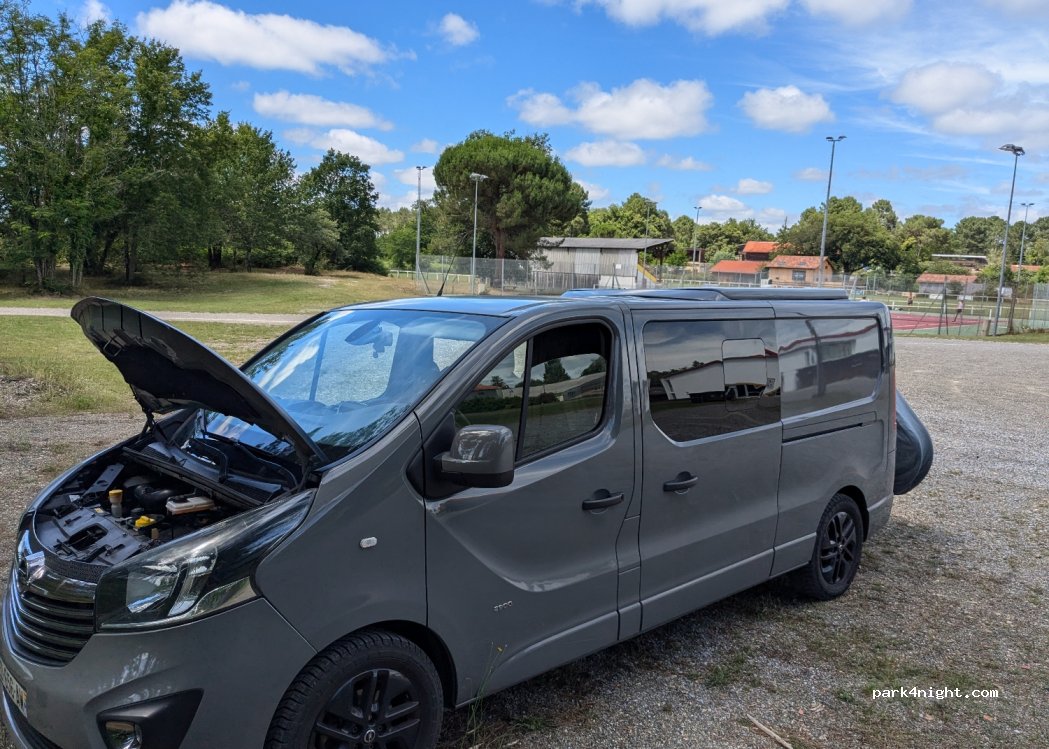 Parking du stade municipal de notre village . Merci de respecter les lieux (poubelles et tri sélectif proches) et attention au barbecue et autres feu car vous êtes dans les forêts de pins (Petit aléa déjà vécu avec des gens de passage qui n’avaient pas conscience de la gravité de leur geste). Les habitants tolèrent gentiment le stationnement à la nuit.