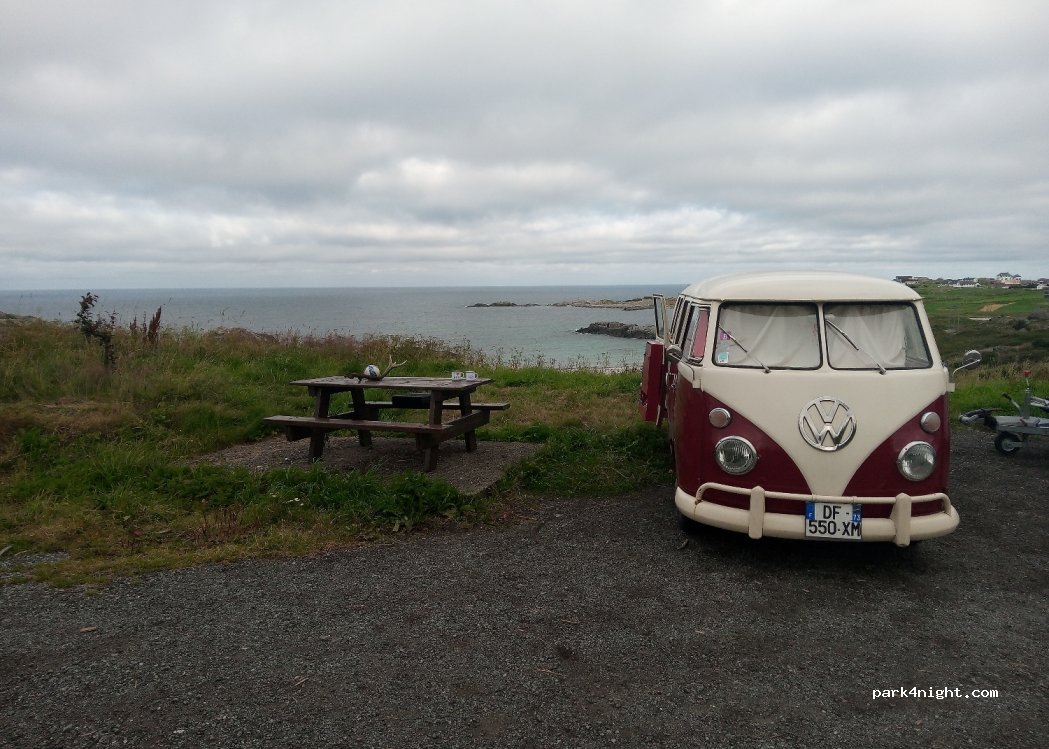 Aire de pique-nique avec tables. place pour trois ou 4 véhicules. partie plate près de la falaise. route calme le soir. belle vue sur la mer et accès plage en contrebas.