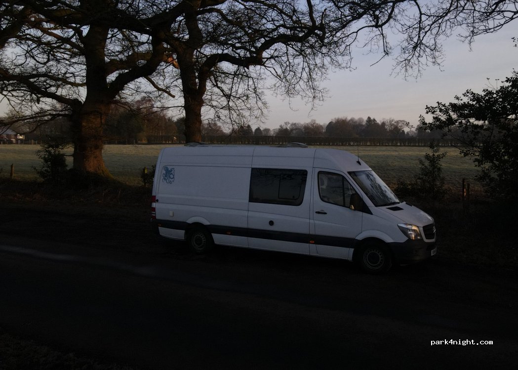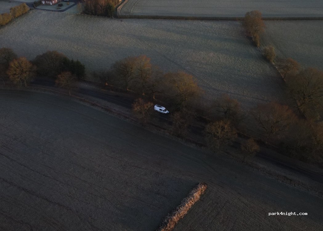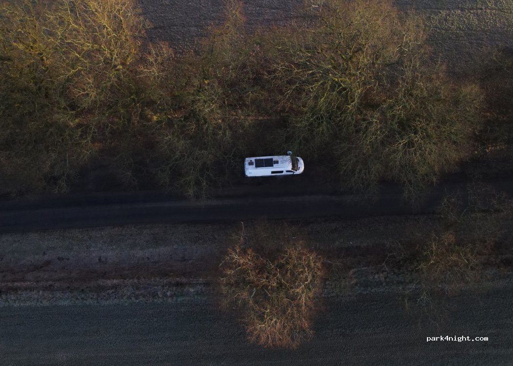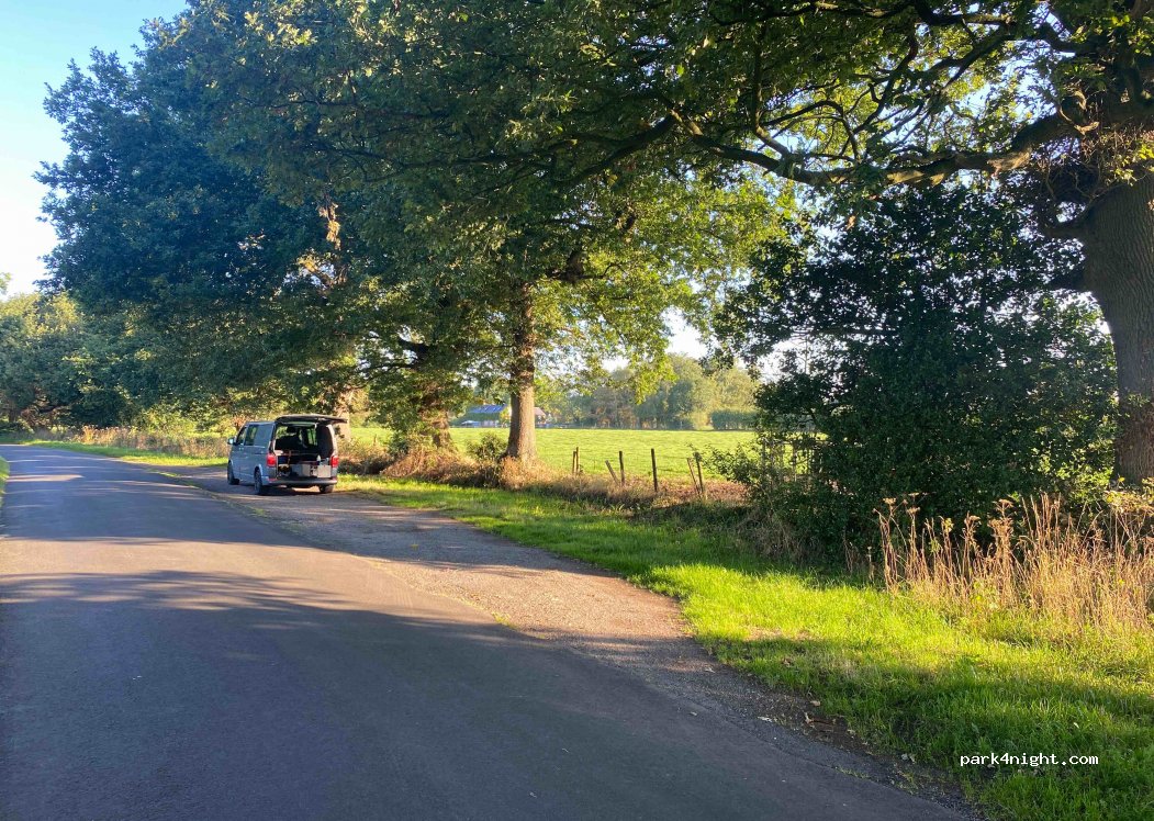 Parking lay-by at the side of a very quiet country lane. Nice views of fields that may have livestock on different days but not when I was there. Not near any houses so not disturbing anyone. Great little spot.