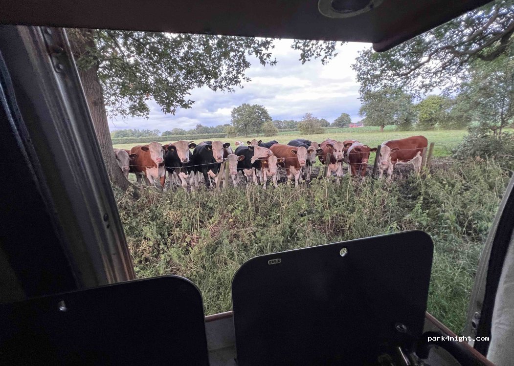 I really liked this quiet spot. There was already a car parked so I pulled in well ahead of them & magically parked completely level. I had a ready-made audience of cows who were fascinated with me. A few cyclists & cars going by, but nothing bothered me.