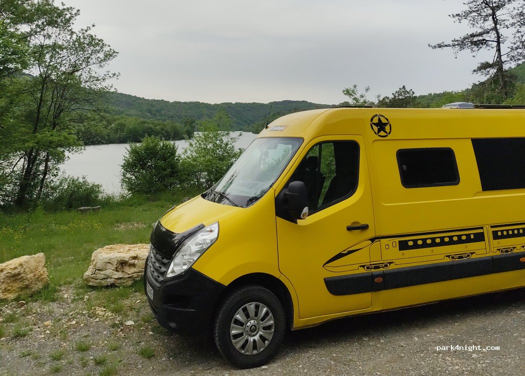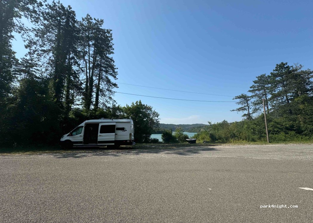 Nature, beau, route un peu passante (1 voiture toutes les 10’, en semaine), juste à côté de la route. Nuit hyper paisible. Possible de descendre au bord du lac mais raide et glissant, mini plage de cailloux.