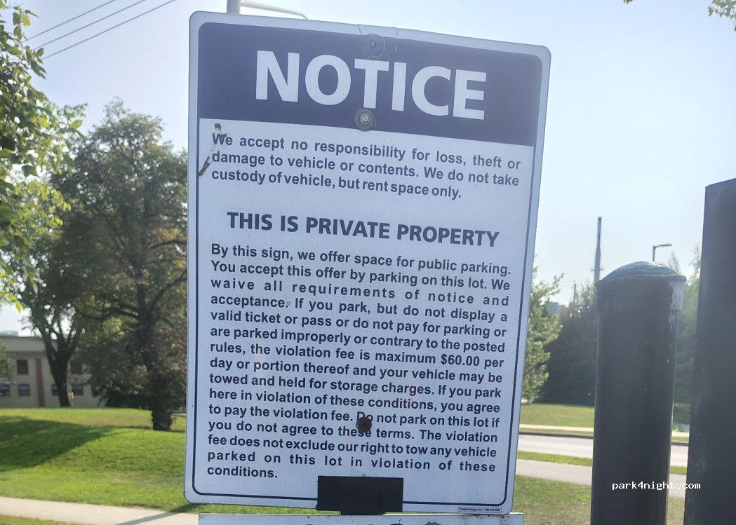 Wow. Beau grand stationnement plutôt droit. Très bien situé. Tarif pour petit véhicule et pour plus gros VR (43$/ 24 heures ). Très achalandé le jour mais pratiquement vide à compter de 16:00. En plus le YMCA est sur le coin de la rue et offre des douches gratuites avec présentation d’une pièce d’identité.