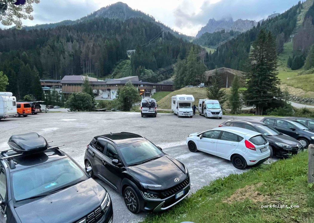 This is a good spot but only for daytime parking. We had a knock from the carabineri whilst having our tea and were asked to move on. They told us overnight parking for campers is not allowed anywhere in Arabba except on the designated Area Sosta Camper to the left of the Portovescovo lift carpark. €20 for 24 hrs or €10 if you stay for 12 hrs.