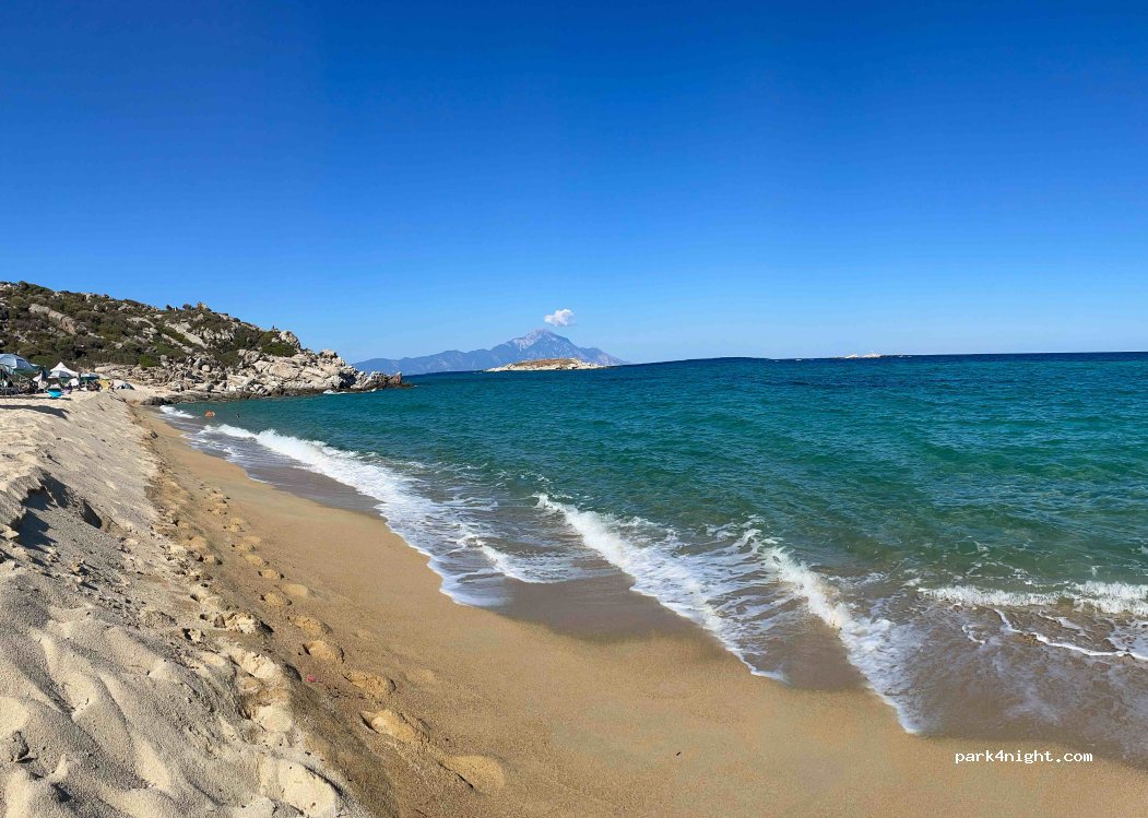 Kriaritsi-Strand. Kostenlose Parkplätze, die anscheinend von Einheimischen genutzt werden und aus irgendeinem Grund nicht auf P4N waren. Die nächsten, die erscheinen, führen zu Privatstränden, während hier der Zugang öffentlich ist, wahrscheinlich der schönste Strand mit Blick auf den heiligen Berg Athos.