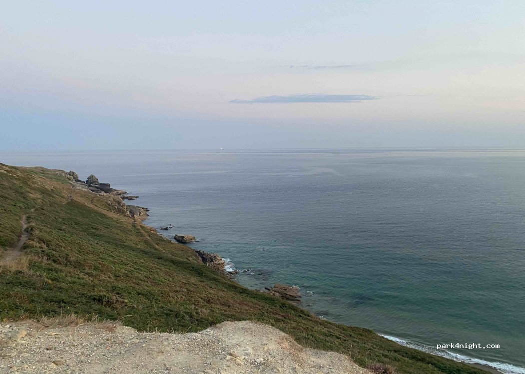 Parking National Trust Rinsey, (parking de don). Parking de taille moyenne pouvant accueillir plusieurs voitures et camping-cars, places côté vue mer beaucoup plus de niveau que l'autre côté. La vue est magnifique, très paisible et calme, nombre d'autres campeurs ici mais tous très respectueux. Sentiers côtiers praticables des deux côtés en partant du parking. S'il vous plaît, ramassez les déchets !