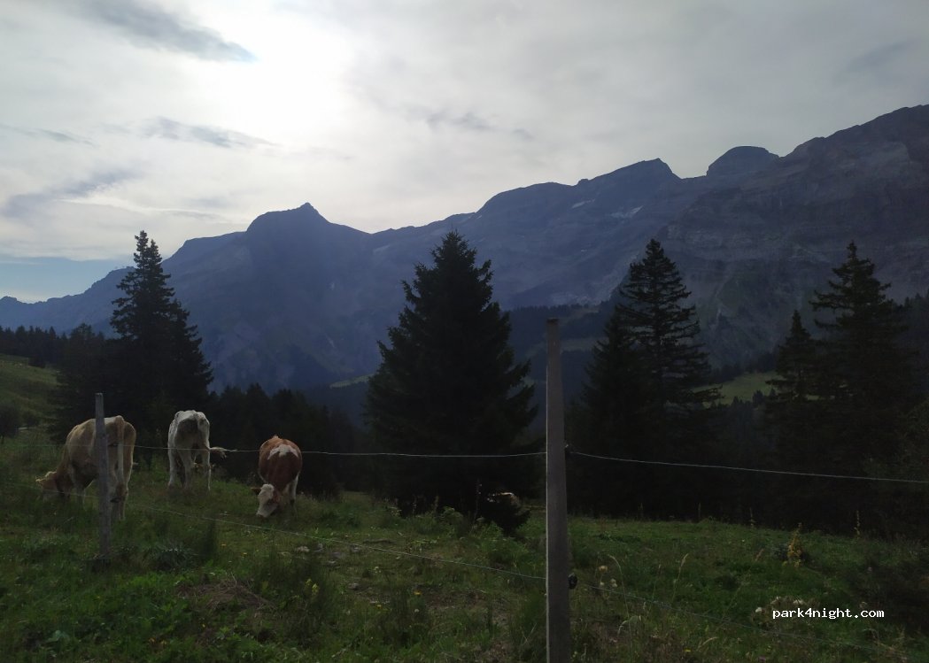 Large grass/gravel area along the Col de la Croix road. Magnificent view of the Diablerets massif. 300m before the pass, starting from Les Diablerets. No services (toilets...) but there are some at the pass. Traffic during the day, on the other hand at night, almost no passage. Very quiet to spend the night, slightly sloping place.