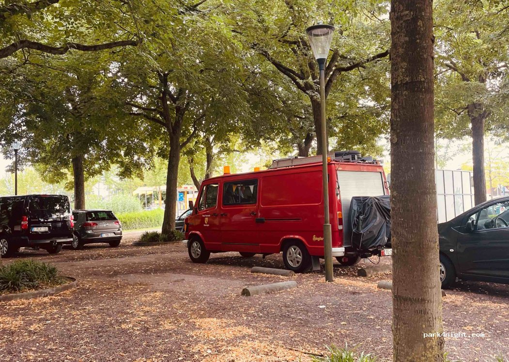 Parking right on the edge of the city center, opposite the train station. Parking bays max. 6m deep, low-hanging branches. In the evening many places free, in the morning it fills up quickly. Public toilets in tol left corner. I'm not sure if they are open 24hrs.