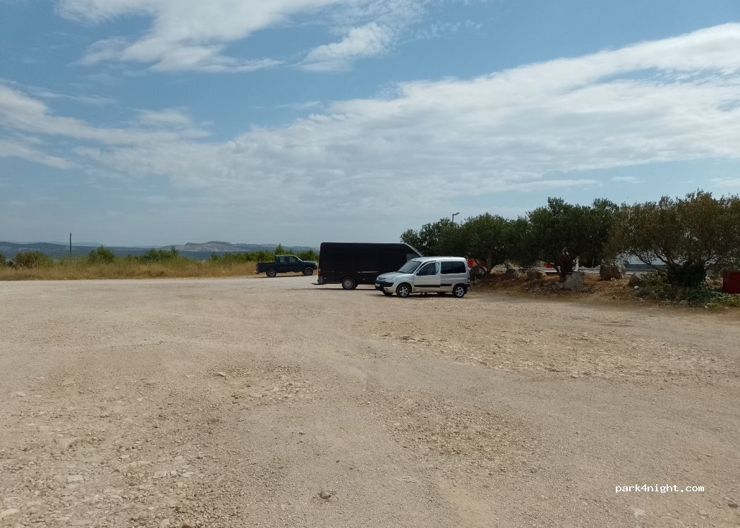 Big, unpaved parking lot next to a petrol station. Toilets at the station. Plodine supermarket nearby. Nice view on the nearby lake and the sea. You can hear a bit the night club from the beach in the village but it's not too loud.
