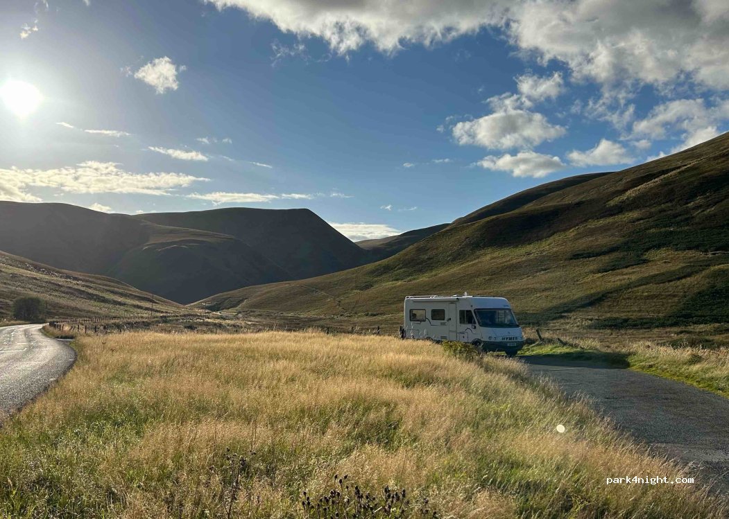 Side of the road parking - sloping. Beautiful views of the surrounding hills. Road does quieten down overnight but some noise early morning. Great for one night en route.