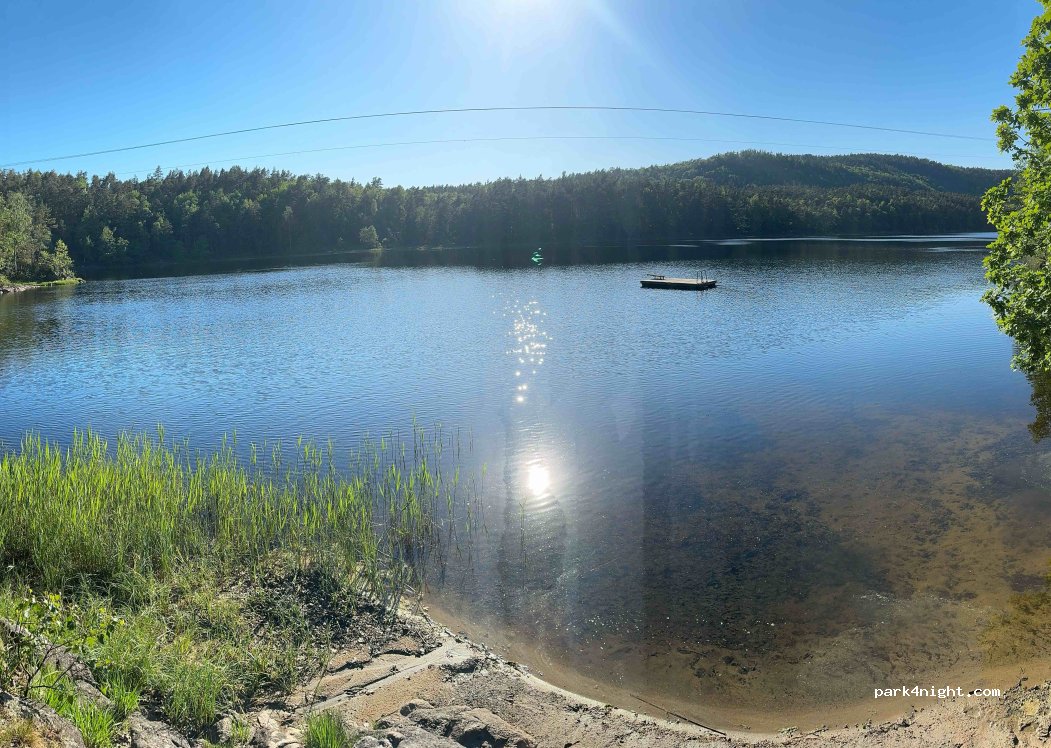 Een zalige plek om even bij te komen van de reis naar Noorwegen toe. Het ligt ongeveer 20 min van de ferry. Ligt aan een rustige weg. Bij mooi weer komen de locale mensen in het meer zwemmen. Mensen zijn erg vriendelijk. Zijn verder geen voorzieningen.