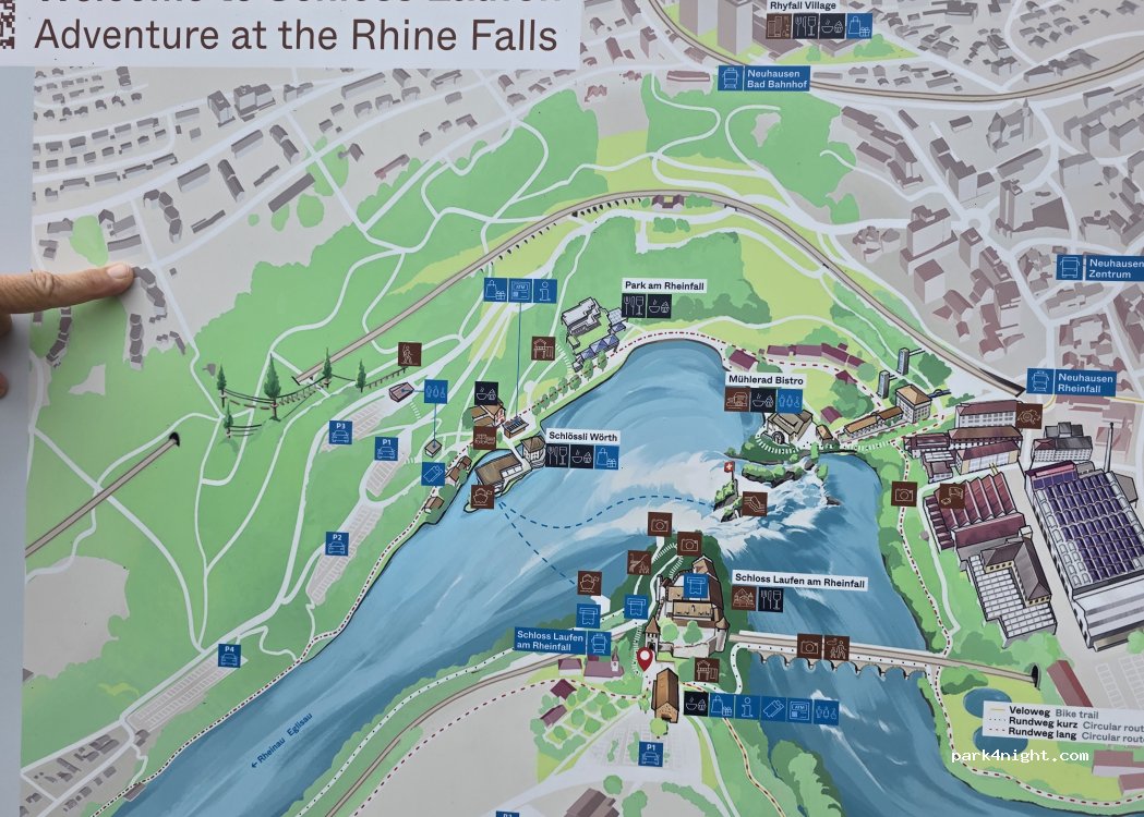 Buen sitio para aparcar y ver las Cataratas del Rin a 10-15 minutos caminando. Hemos aparcado unas 4 horas ( de 13 a 17 )y sin ningún problema. ( Para pasear en barco por las cataratas está cerrado hasta el 29 de Mayo )