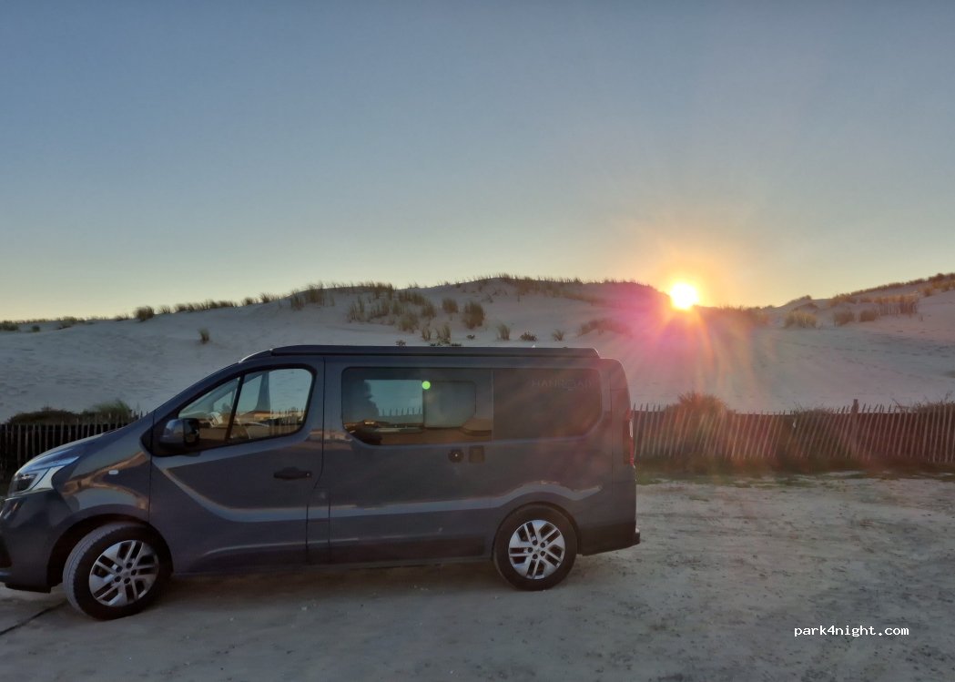 Nous nous sommes garés sur ce parking avec notre van de 15h à 11h le lendemain matin, en compagnie de plusieurs camping cars. Beau coucher de soleil sur la plage. Nuit plutôt calme, juste un peu de bruit jusqu'à minuit. Toilettes, douches de plage et point d'eau à l'entrée de la grande plage à côté du bar restaurant, rue piétonne à 5min à pied.