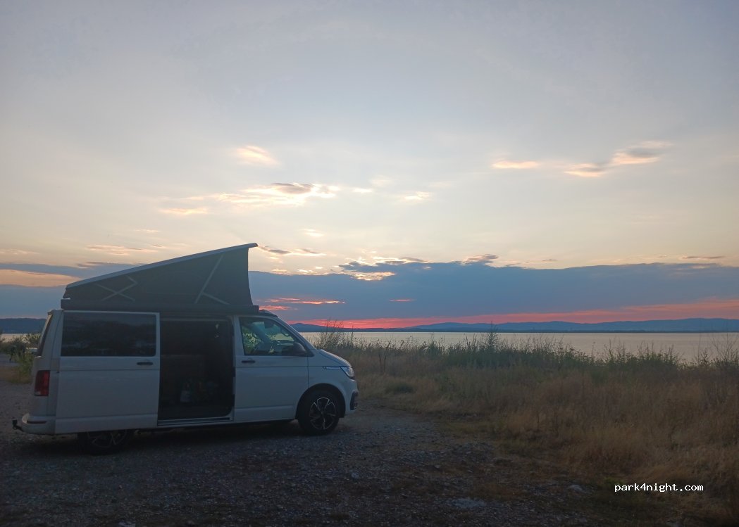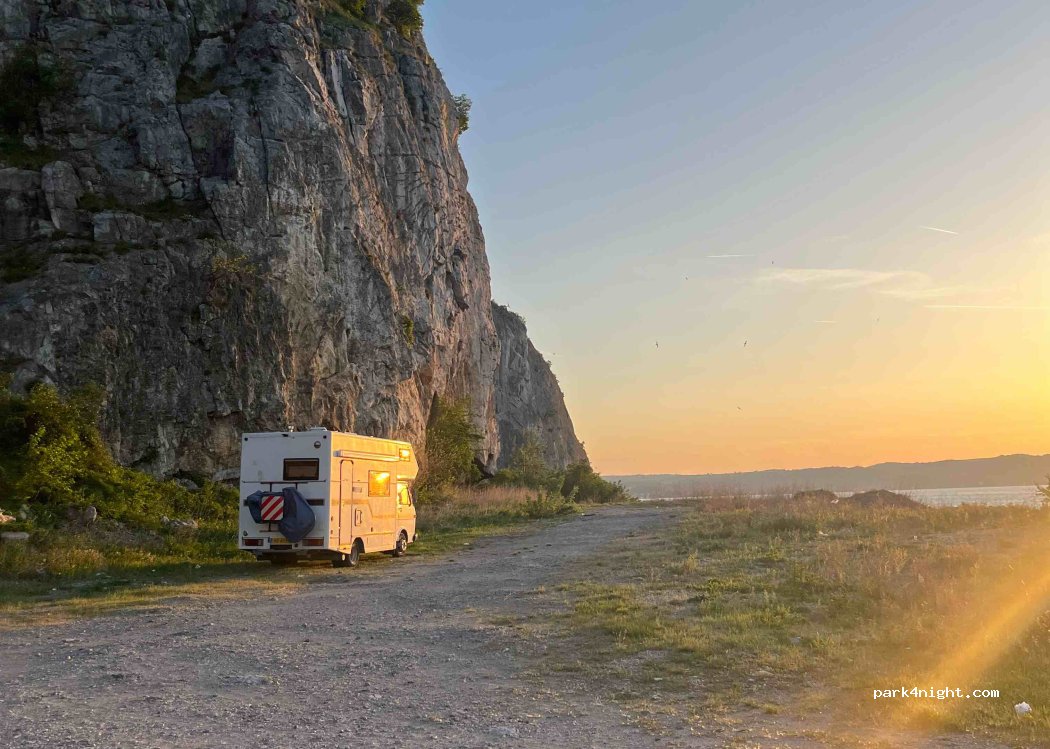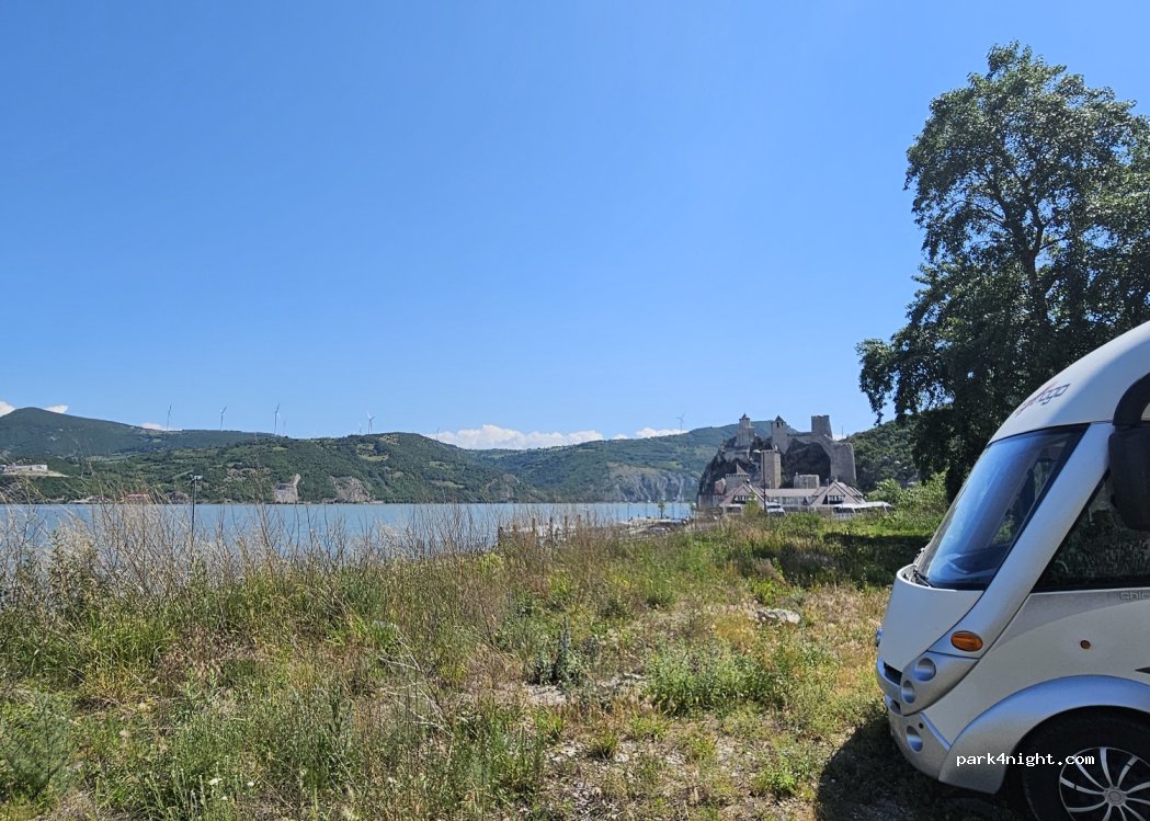 Très bon emplacement pour passer la nuit. Accès facile. Belle vue sur le Danube avec le coucher de soleil magnifique, et sur le beau château. Grand espace plat pouvant accueillir plusieurs véhicules. la route passe juste au-dessous, mais il n'y a pas trop de circulation la nuit.