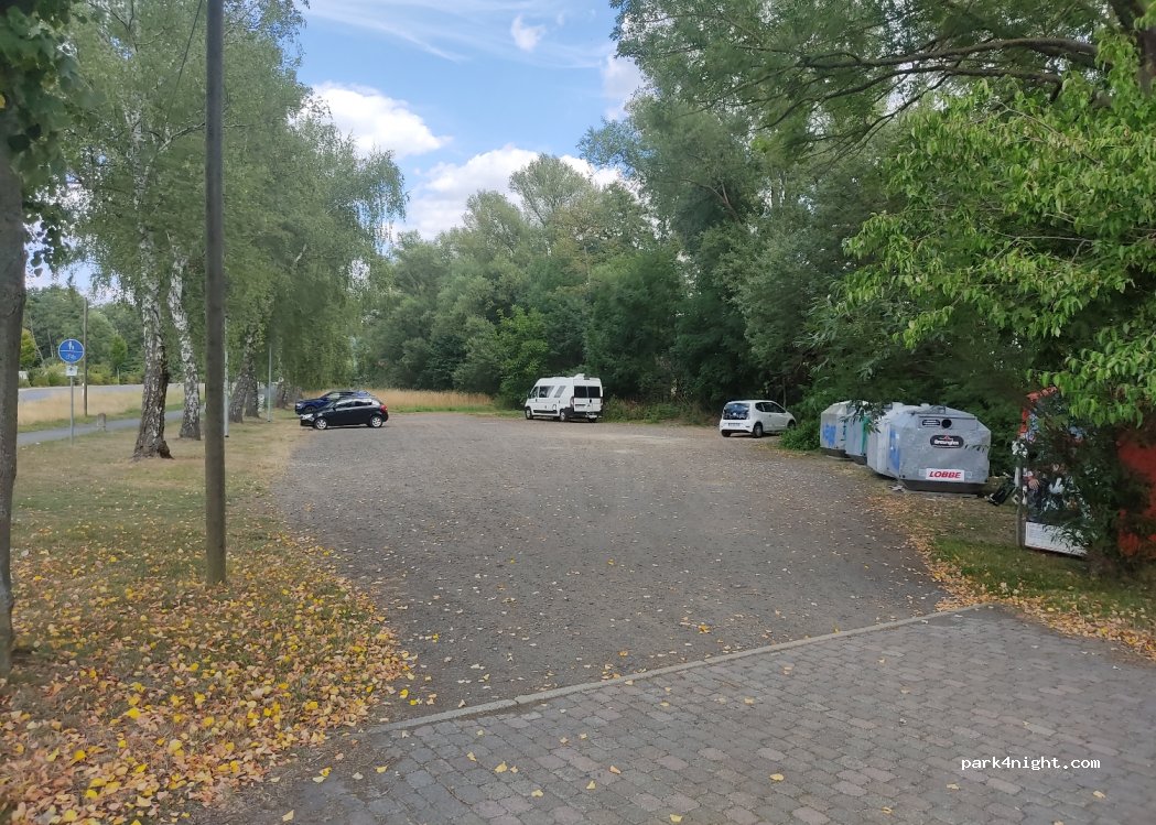 Freier, ebener Schotterplatz an der Straße. Nachts sehr ruhig. Am Anfang Glascontainer.