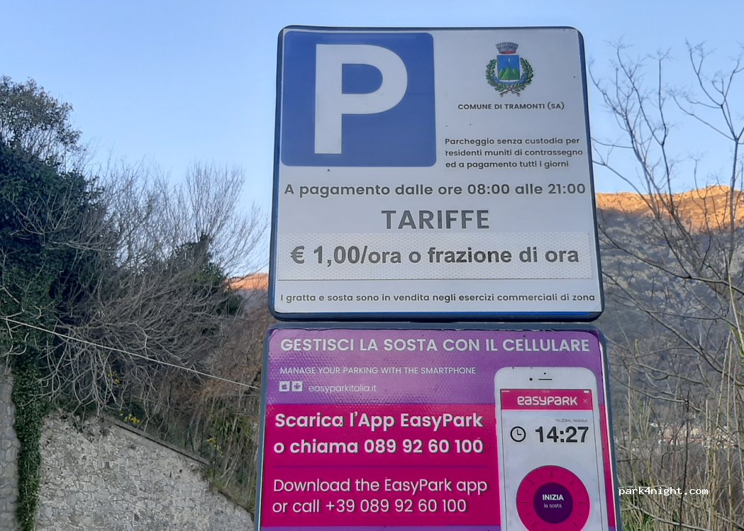 Desde Enero 2025 precio 1 € por hora todos los días de 8 a 21 hs. todos los parking de Tramonti. la policía local nos aconsejo amablemente aparcar aquí y no en el otro q es más pequeño.