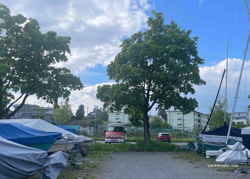 Parkplatz direkt am See an einem kleinen Hafen. Kein direkter Blick auf den See vom Parkplatz, aber nur 50 m entfernt sitzt man gleich am Steg. Neben einem Strandbad und der Bahn gelegen. Restaurants an der Hauptstraße ca. 500 m entfernt. 1 CHF pro Stunde, per App bezahlt.