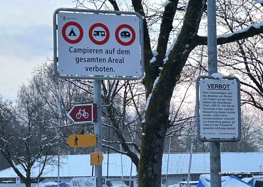 Wie beschrieben. Mit grossem Womo tagsüber, bei schönem Wetter während der Badesaison schon eng. Ab ca 18:00 immer besser. Ca 10' zu Fuss, coole Strandbar ( Hirsis Seelounge ) mit feinem Essen und gratis Warmdusche nebenan. Unbedingt die CHF 5.-/24h bezahlen;). DANKE der Gemeinde Cham für diese Parkmöglichkeit !
