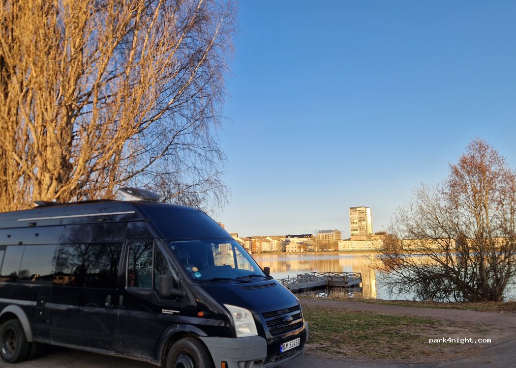 Grote parkeerplaats, 20 min lopen vanaf centrum. Gratis parkeren en wil je stroom, dan kost dat 50 sek. Je mag hier 24 uur staan. Mooi uitzicht op het water.