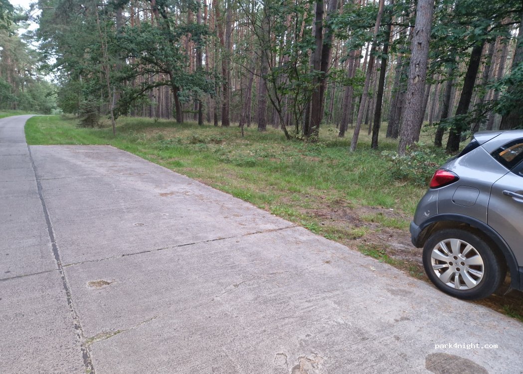 Little used road in the forest, leading to a transmitter (where the road actually ends). Spent a day here, while approx. 10 cars drove around me without blinking an eye. No traffic from 6 p.m. and no prohibition signs, might be also ok for the night, but I didn't try. The noise from E26 is noticeable, but not unbearable. Hiking and cycling trail 50 m from the place - perfect for little walk in the forest.
