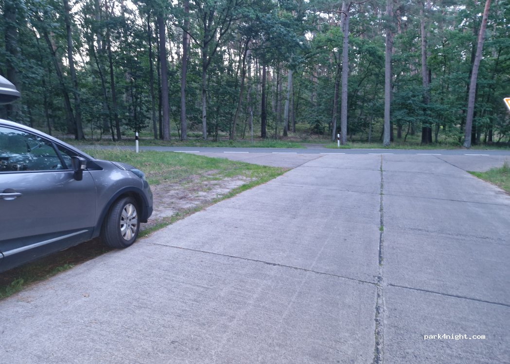 Camino poco usado en el bosque, que conduce a un transmisor (donde realmente termina el camino). Pasé un día aquí, cuando aprox. 10 autos me pasaron sin pestañear. Sin tráfico a partir de las 6 de la tarde y sin señales de prohibición, también puede ser bueno para la noche, pero no lo intenté. El ruido de E26 es notable, pero no insoportable. Sendero para peatones y bicicletas a 50 m del lugar, perfecto para un breve paseo por el bosque.