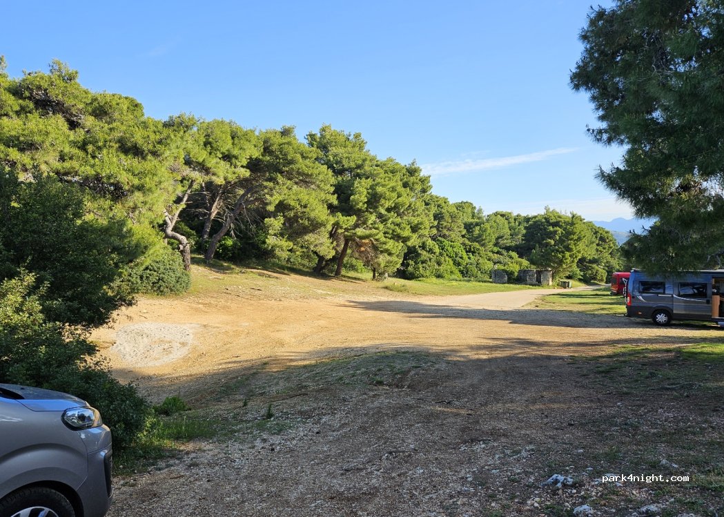 Parking lot on a beautiful sandy beach. Perfect for snorkeling, swimming and sunbathing. No overnight stays. You stand under olive trees, so also shady. There is also a bathing beach. And street dogs, very nice, are happy about a little something to eat and drink.