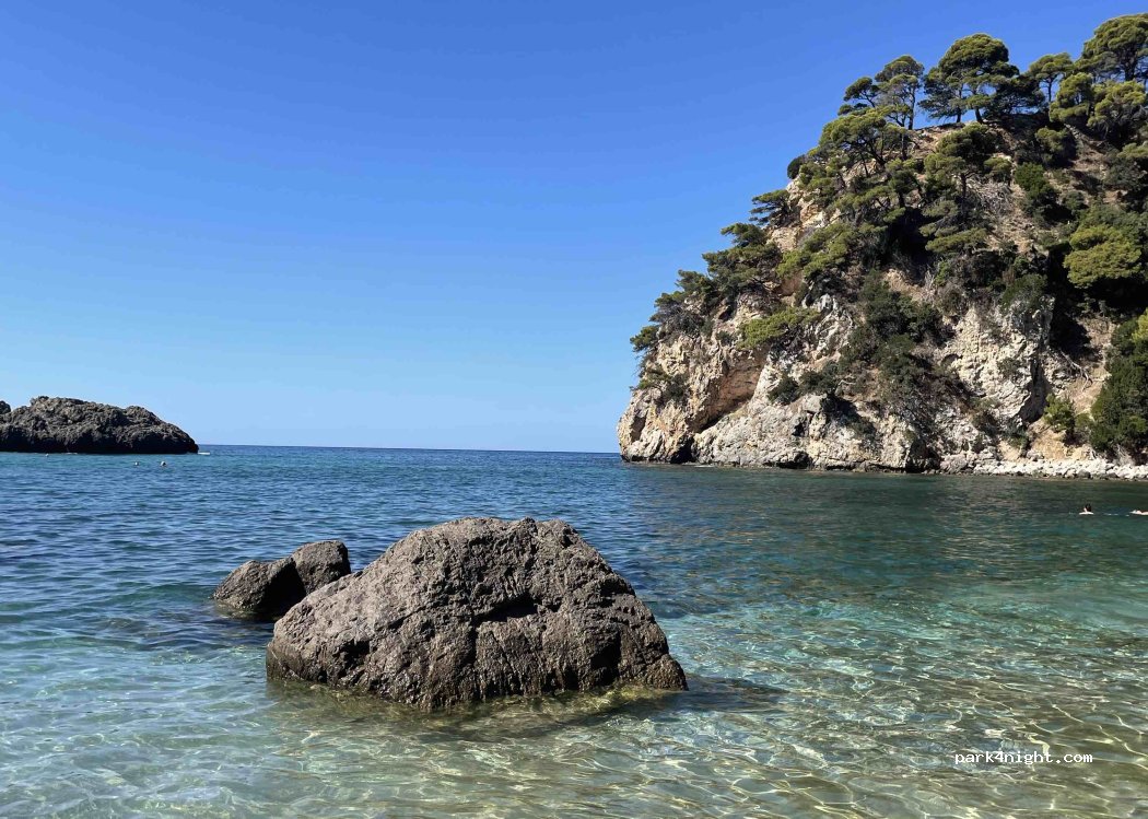 Parkplatz an einem wunderschönen Sandstrand. Perfekt zum Schnorcheln, Schwimmen und Sonnenbaden. Keine Übernachtungen. Sie stehen unter Olivenbäumen, also auch schattig. Es gibt auch einen Badestrand. Und Straßenhunde, sehr nett, freuen sich über eine Kleinigkeit zu essen und zu trinken.