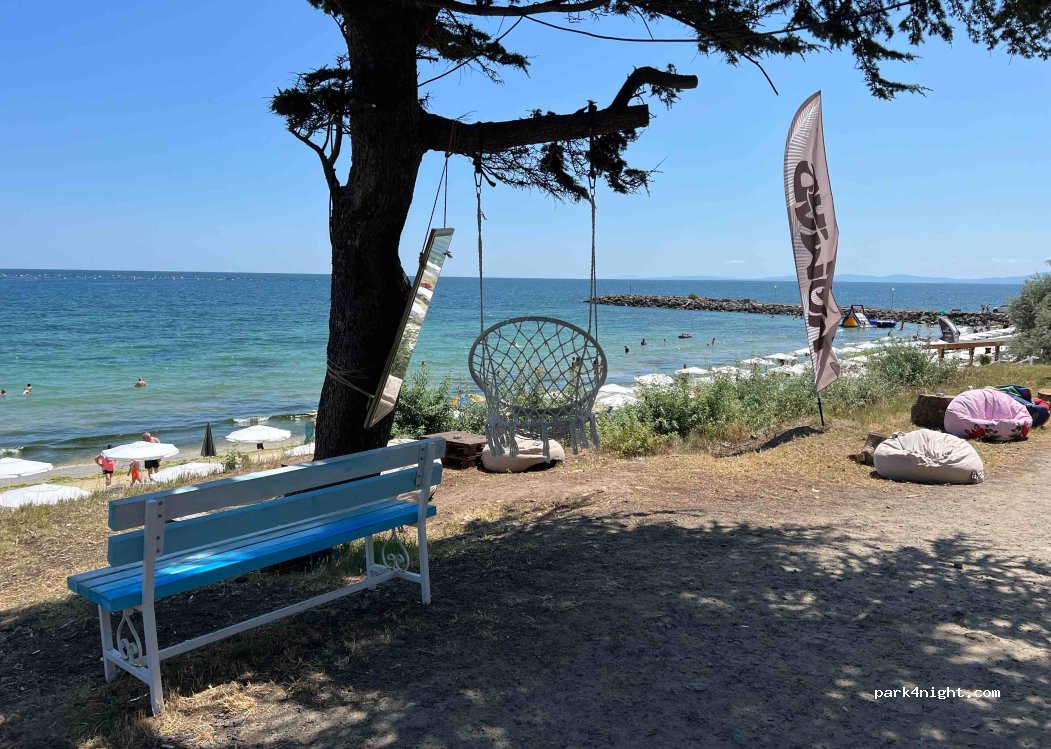 Pozicija ob plaži dobra. Lepa senca. Sanitarije osnovne. oskrbnica ali receptorka zna samo bolgarsko. ne omeni možnosti avtobusa ali taxija za ogled bližnjega nessebarja. ponuja samo svoja kolesa, ki so v bolj slabem stanju. Cena previsoka glede na ponudbo