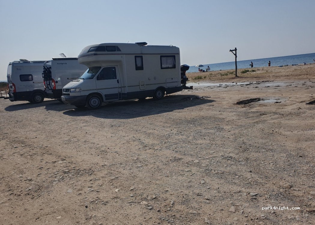 Good place to park in the evening and sleep quiet. The place is exactly near the beach. A nice camping wich beach bar & taverna exactly near. As you walk around the beach there are about 7 -8 beach bars. No shaddow at all.