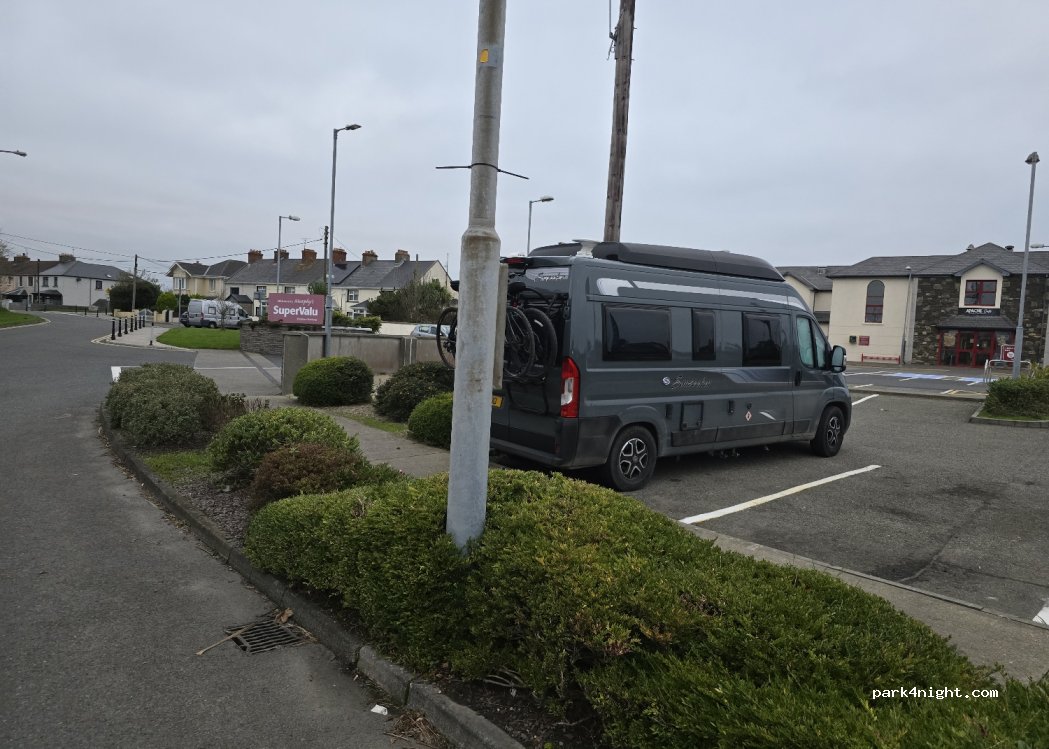 SuperValu car park. No prohibition signs or height limitations. Good for after or before boarding the ferry. We did the shopping in the supermarket, clean and tidy, also takeaway, pizzeria and pharmacy next door. Some truck noise at dawn.