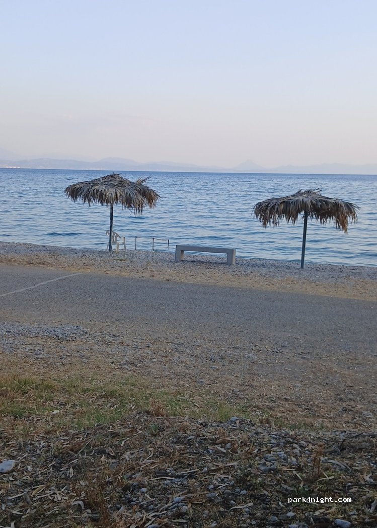 Bon spot au bord de mer avec vue sur les lumières de Patras. Douche et poubelle sur place. Nous étions seul hors saison. Les places sont au bord de la route. Pas de service.