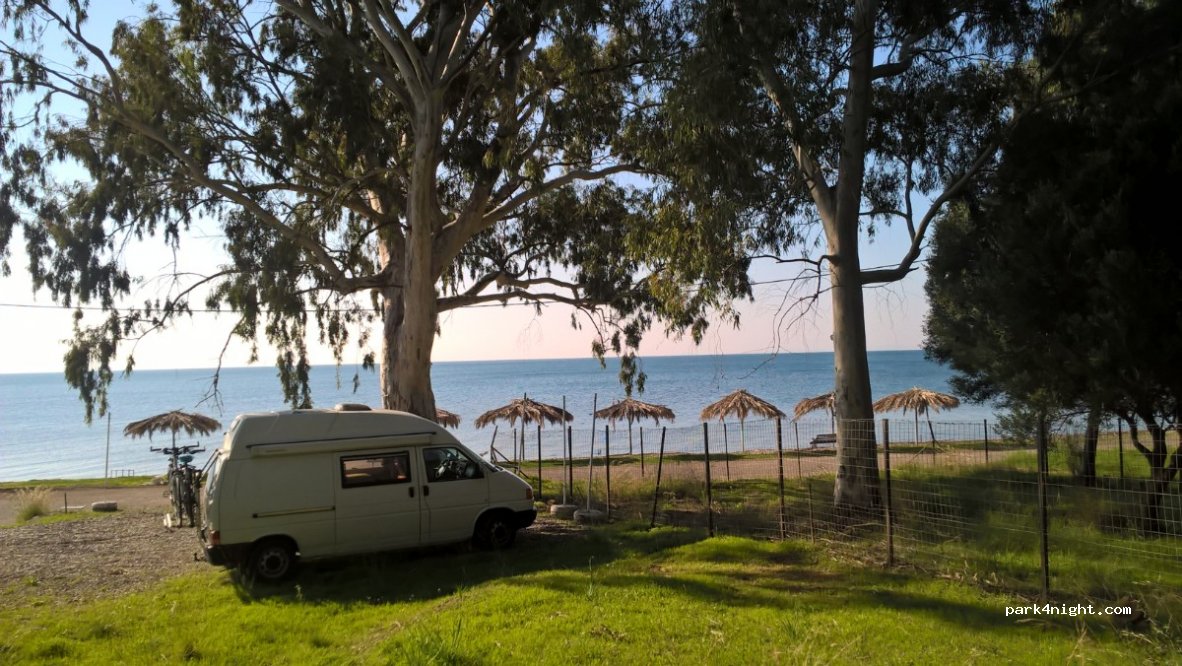 Très beau et accessible spot. La plage à cette saison est déserte. Beaucoup d'algues et quelques déchets essentiellement apportés par la mer (-1*). Poubelles et eau (robinet au sol au bord de la petite route à G du terrain de Volley). Parfait pour nous pour une nuit d'étape en venant du Péloponnèse, sur la route pour prendre le Ferry à Igoumenitsa. Le passage du pont nous a coûté 21 euros.