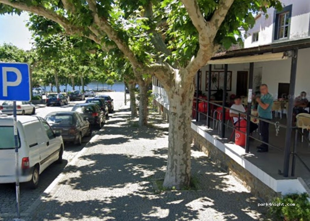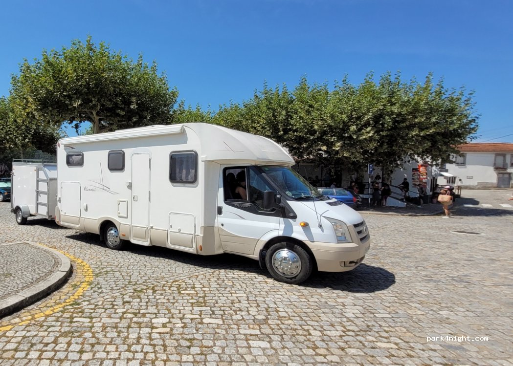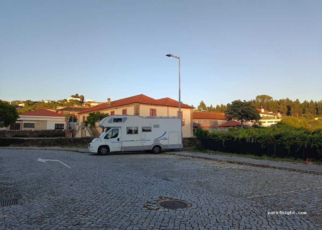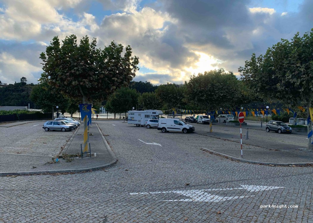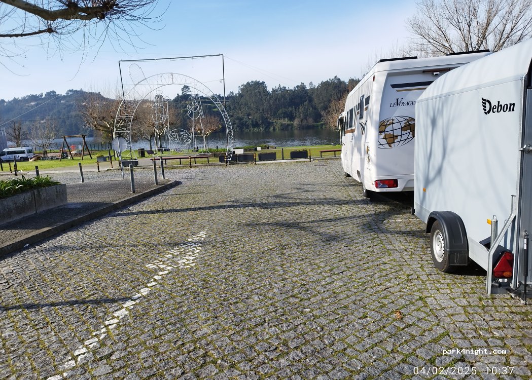 Stone paved P slightly tilted in a green area next to the Douro river, beside MELRES village, with a river beach, bars, restaurants, supermarket and showers on the beach. Very quiet place to spend the night and very good access from N108 road for motorhomes even with a trailer.
