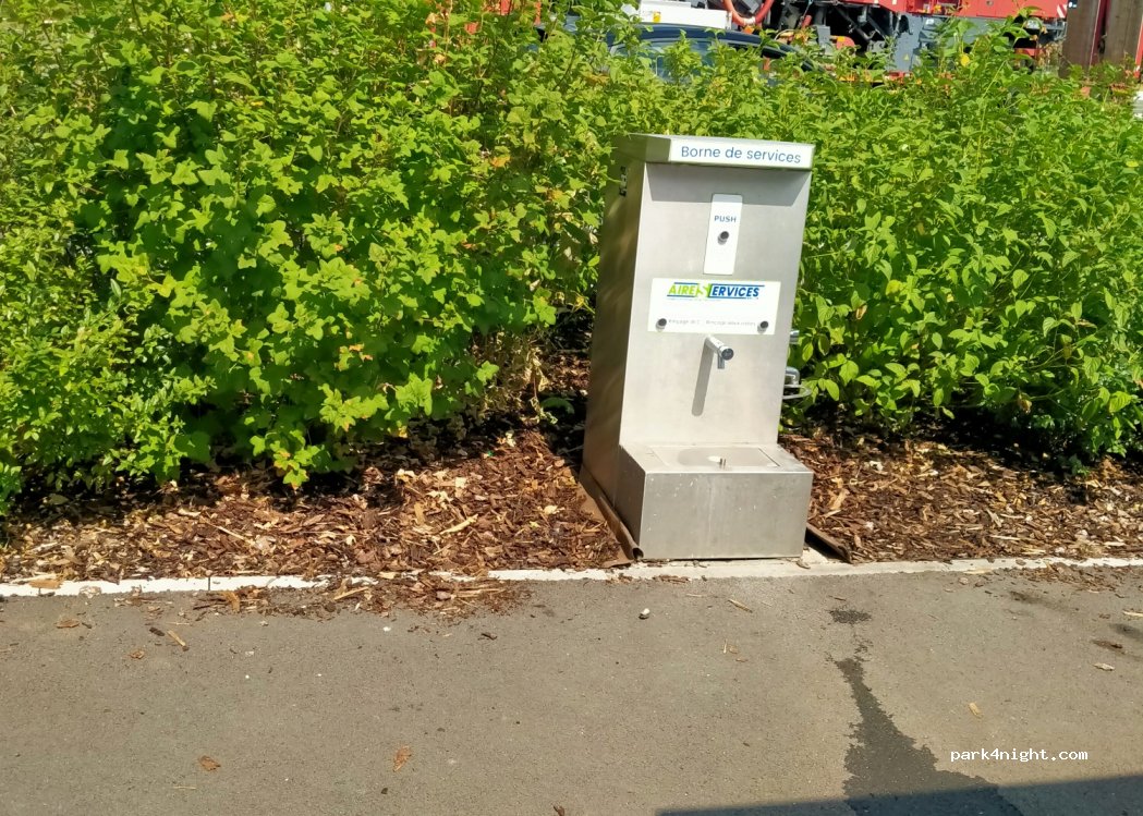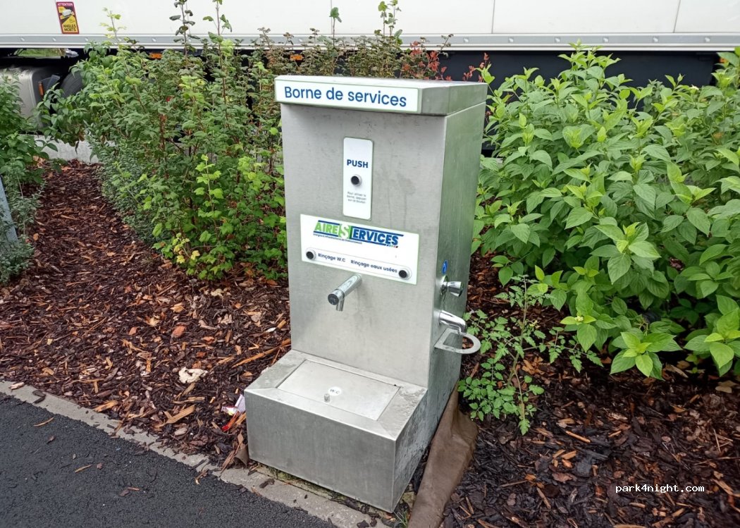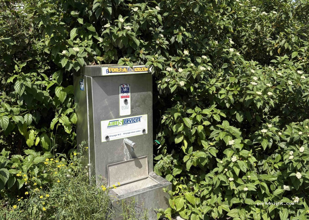 Aire fonctionnelle et gratuite, vous avez besoin de ramener un tuyau pour remplir l'eau propre. Elle se situe après la station essence sur la gauche, juste avant la sortie de l'aire d'autoroute.