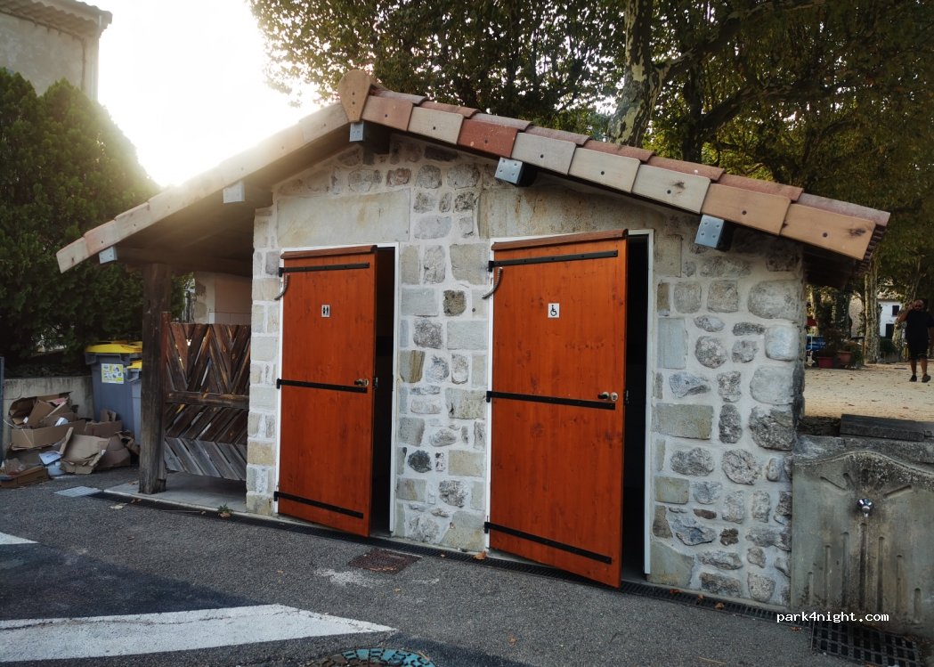 Toilettes publique, accès à de l'eau potable, restaurants et bar à proximité.