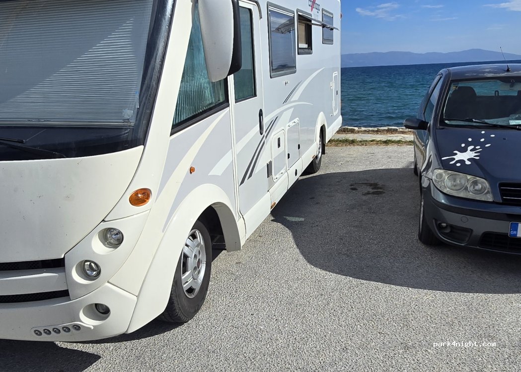 gece kalıp devam etmek için güzel. hemen sahilde. yol ile deniz arasında o nedenle biraz gürültü olabilir. yaklaşık 200 metre ileride plajın duşları var. 2 tane sahilde wc var. biraz eski ama temiz. çeşmeler var. su problemi yok yani. wc de idare eder. kavala merkeze yakın. akşam sivrisinek sürüsü vardı, gündüz iyiydi