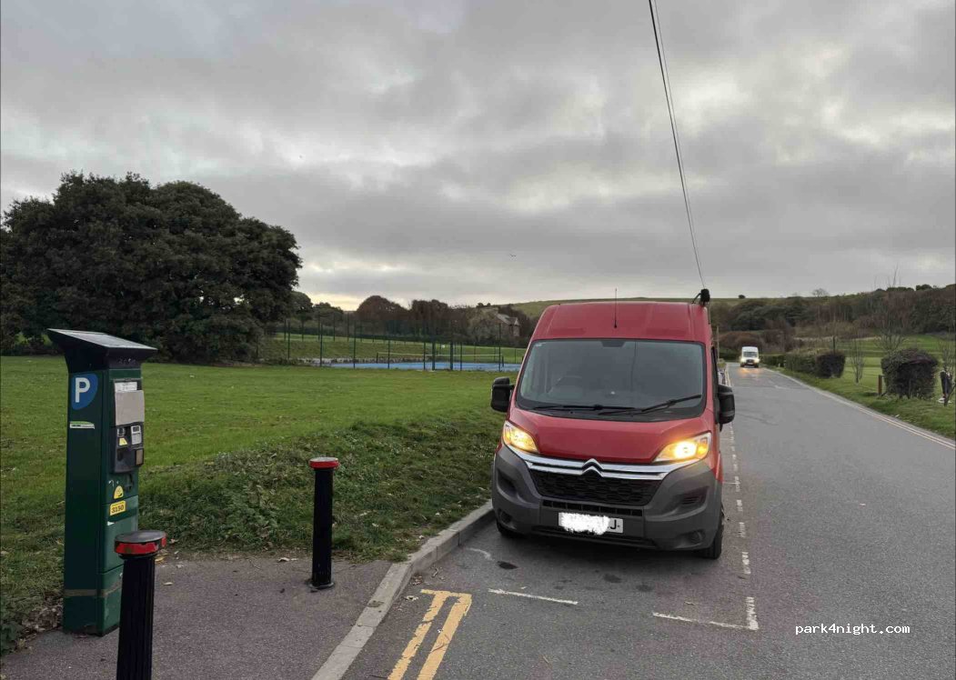 Nice spot, very chill. 15 minute cycle to the pier/town. Loads of van spaces. Spoke to a council worker cutting the hedge and he said he hasn’t seen a parking warden there for 10 years. Didn’t even need to pay in the day time.